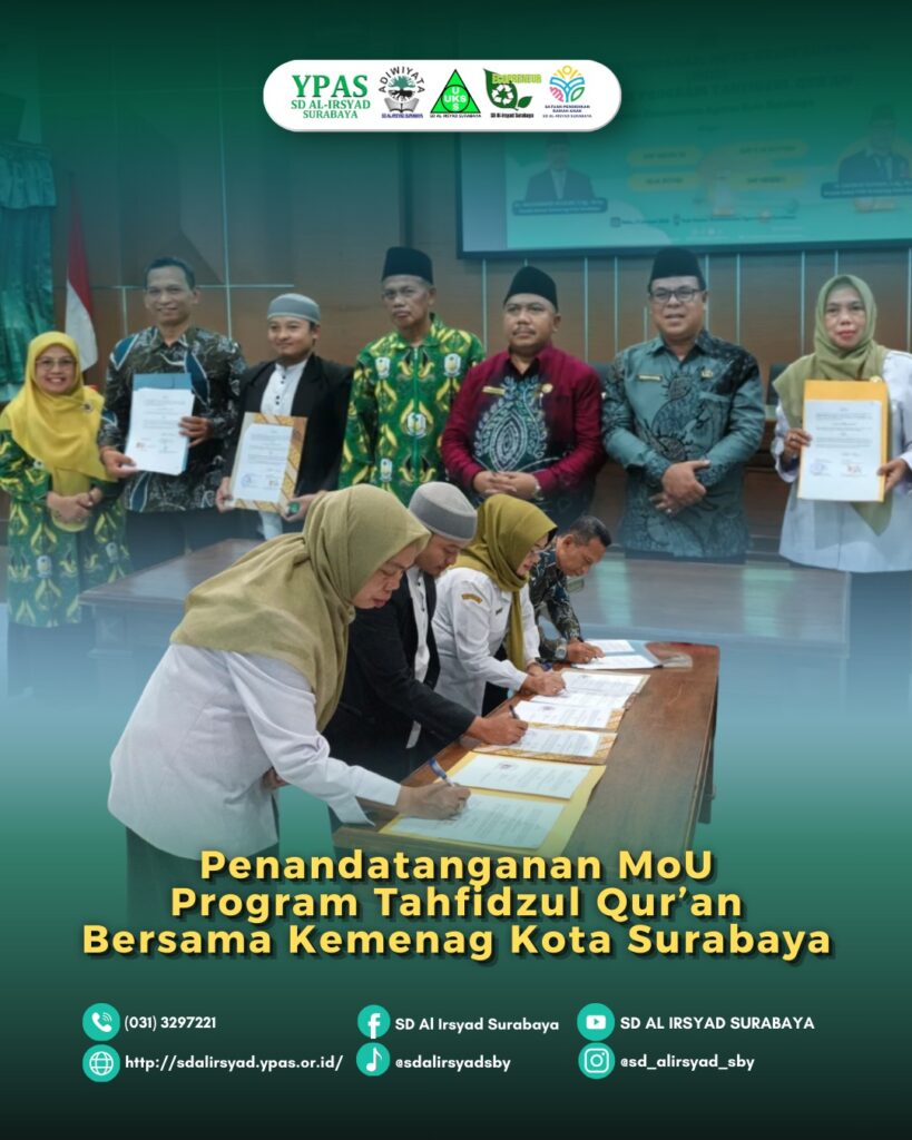 SD Al-Irsyad Surabaya resmi menandatangani Nota Kesepahaman (MoU) Program Sekolah Tahfidzul Qur’an bersama Kantor Kementerian Agama (Kemenag) Kota Surabaya pada Rabu, 21 Januari 2026. Kegiatan ini berlangsung di Aula Kemenag Kota Surabaya dan menjadi langkah strategis sekolah dalam memperkuat pendidikan Al-Qur’an secara terencana dan berkelanjutan. Penandatanganan MoU ini diwakili langsung oleh Kepala SD Al-Irsyad Surabaya, Ustadz Suda’i, S.Pd, didampingi oleh guru agama sebagai bentuk komitmen institusi terhadap program unggulan tahfidz.